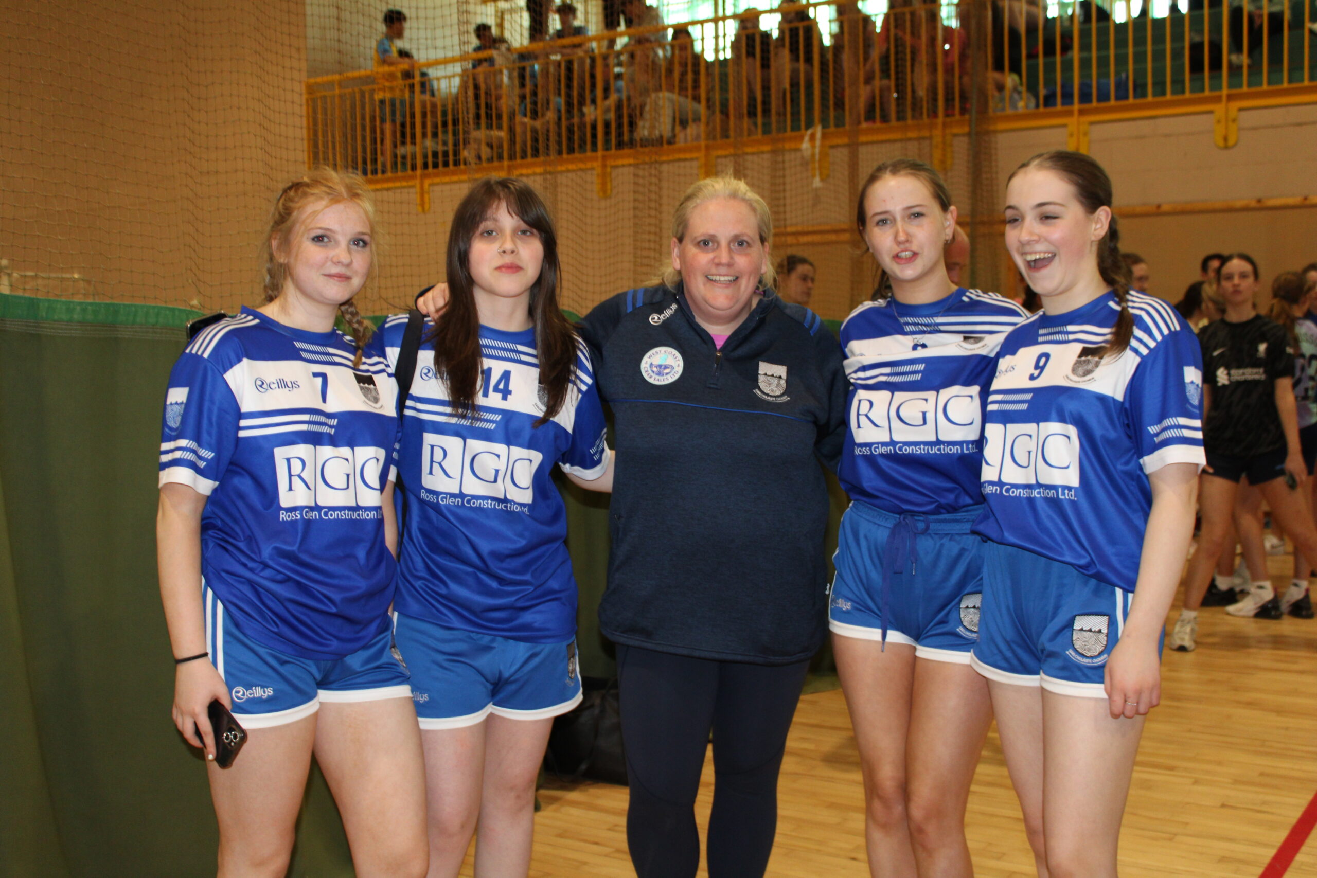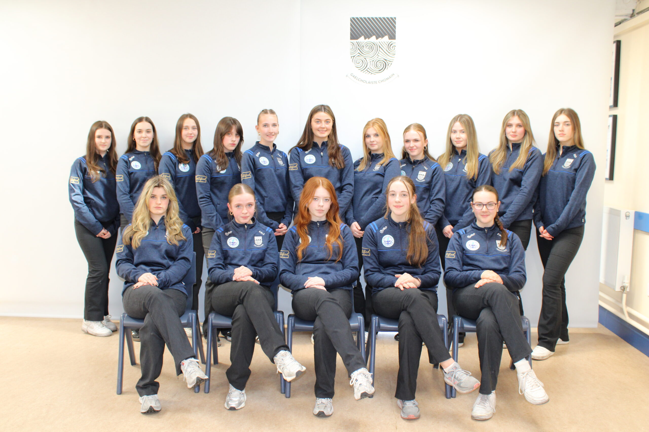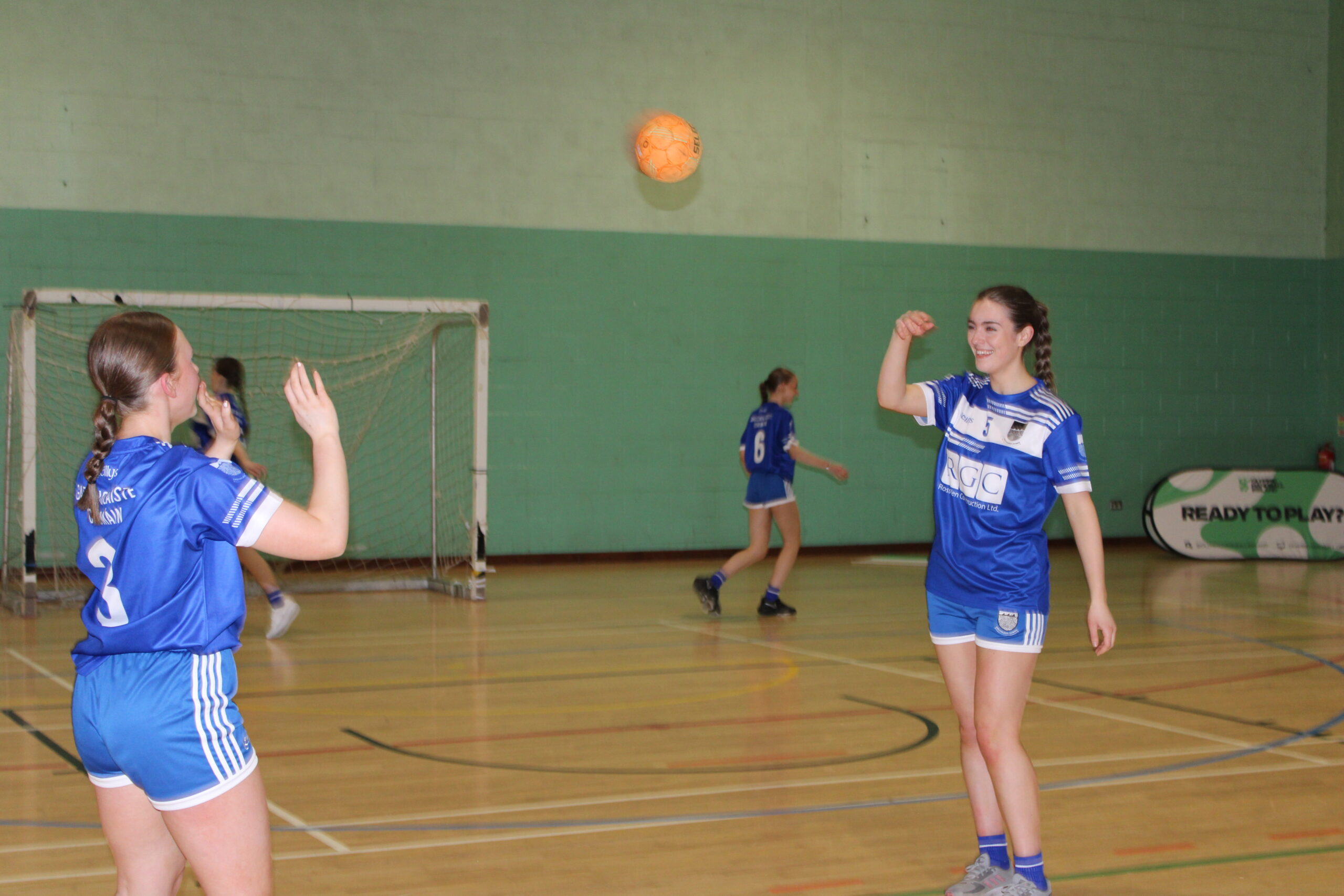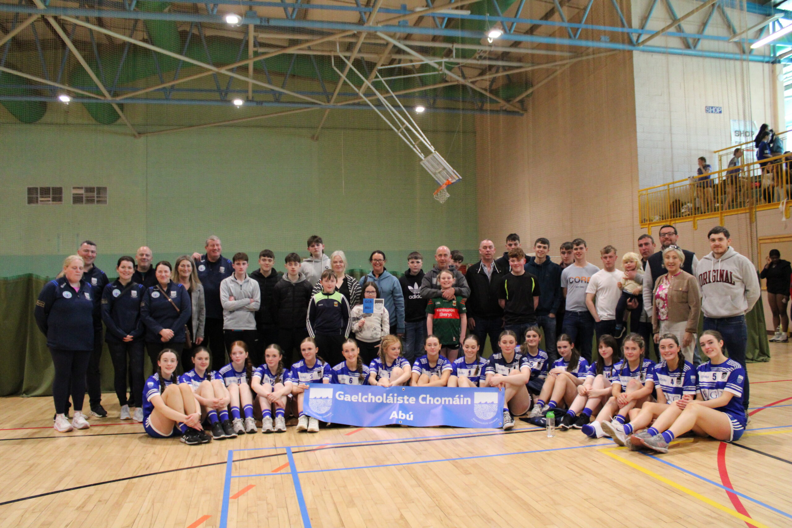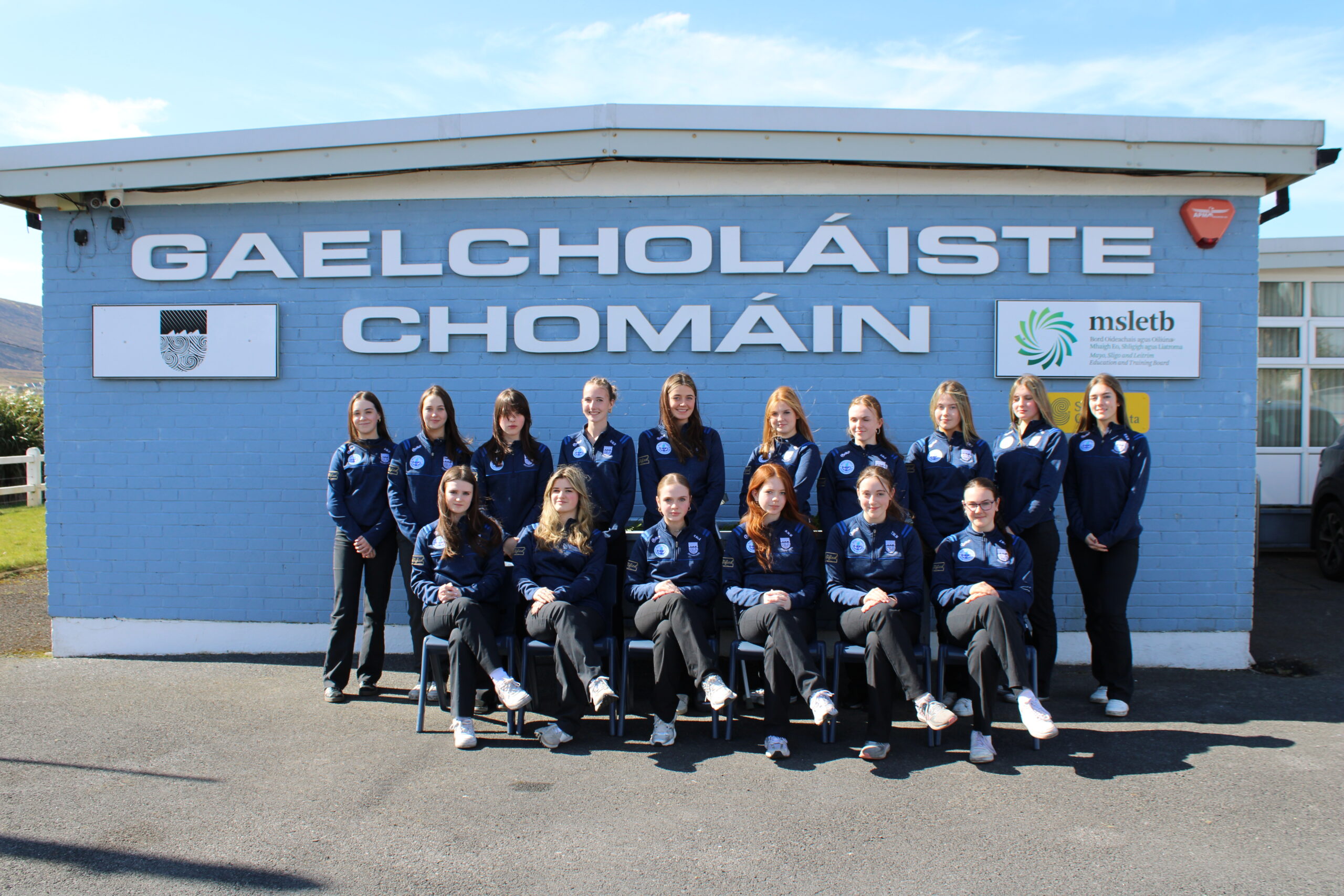 Tá foireann buachaillí agus cailíní ag imirt sacair do Ghaelcholáiste Chomáin.