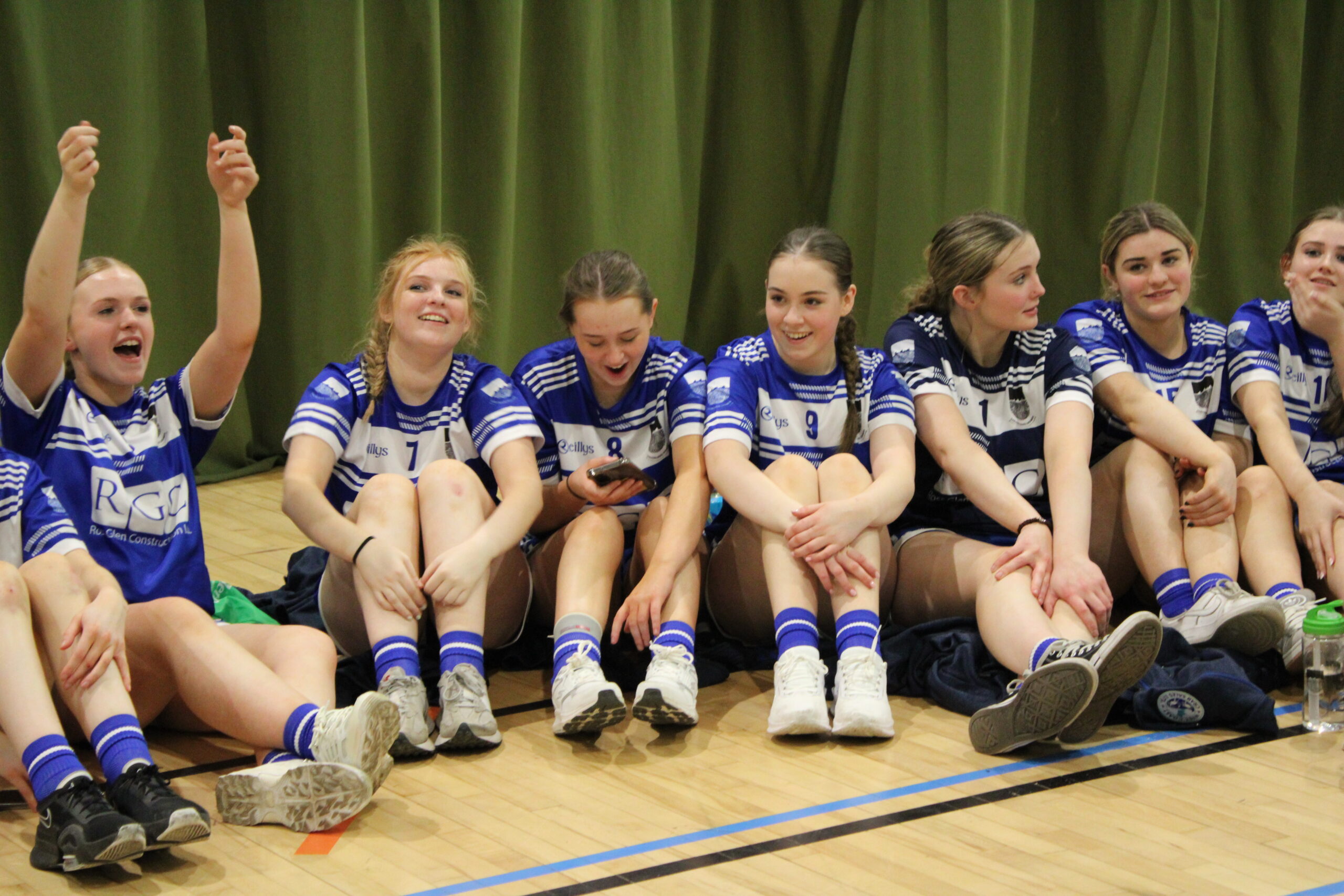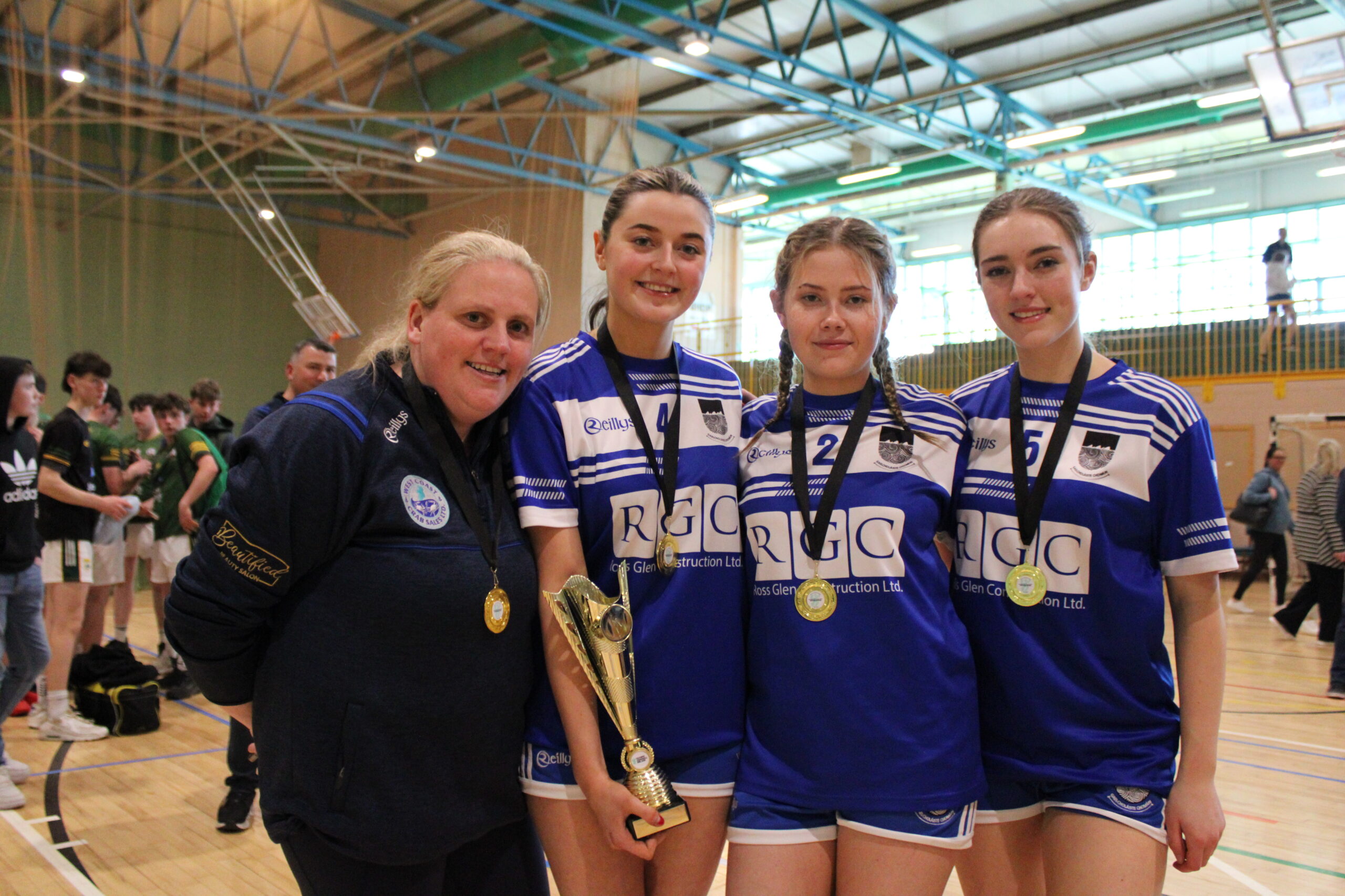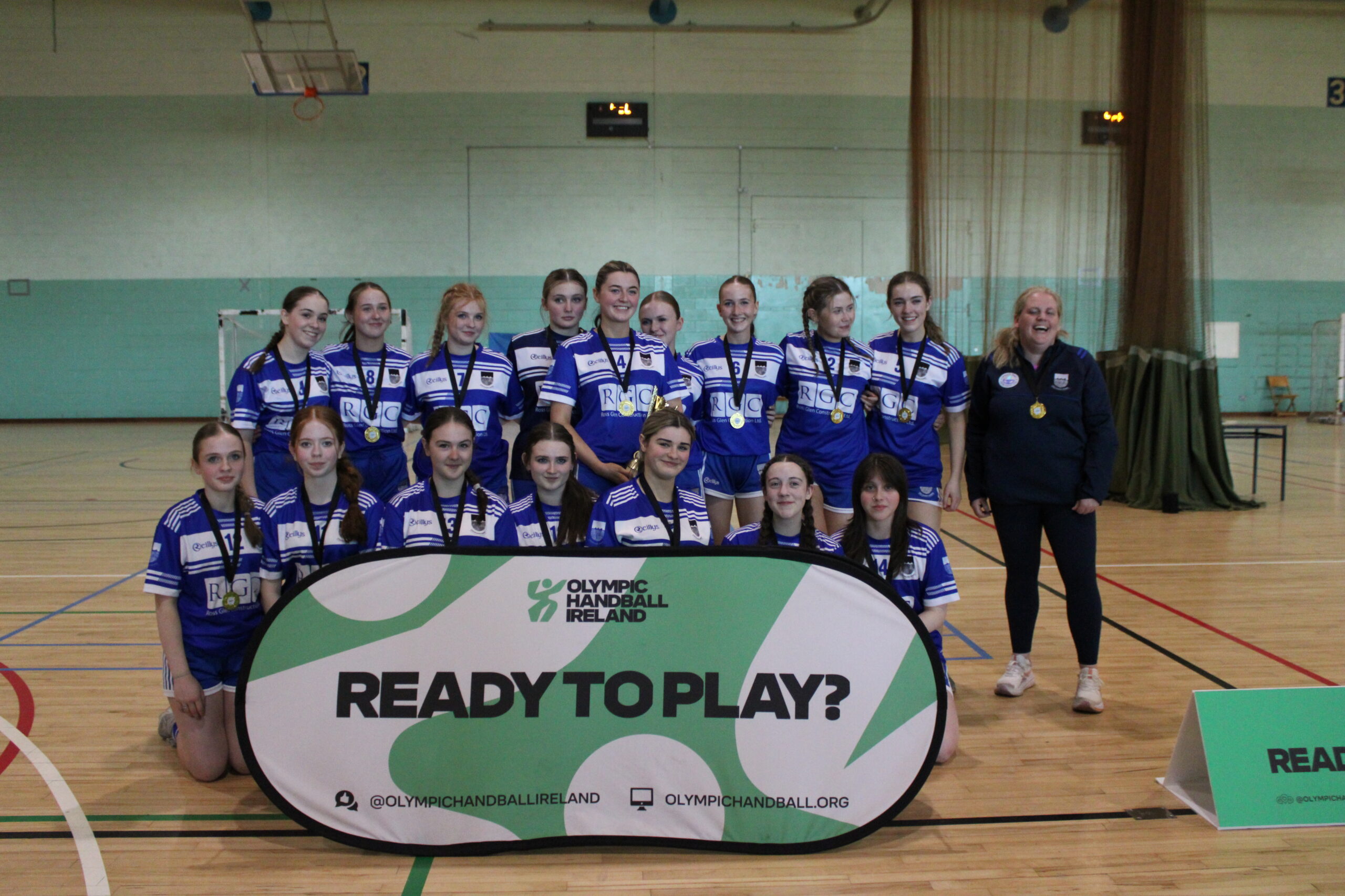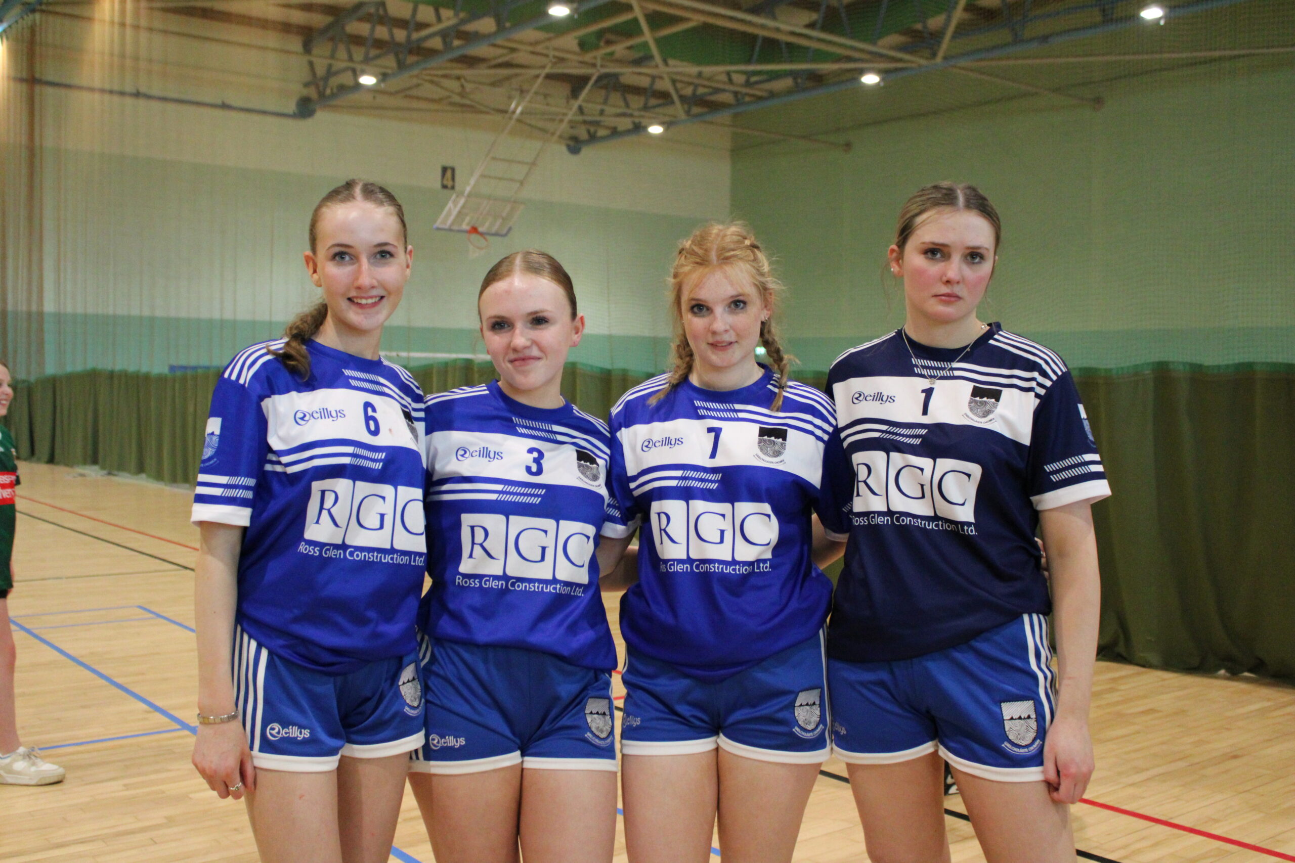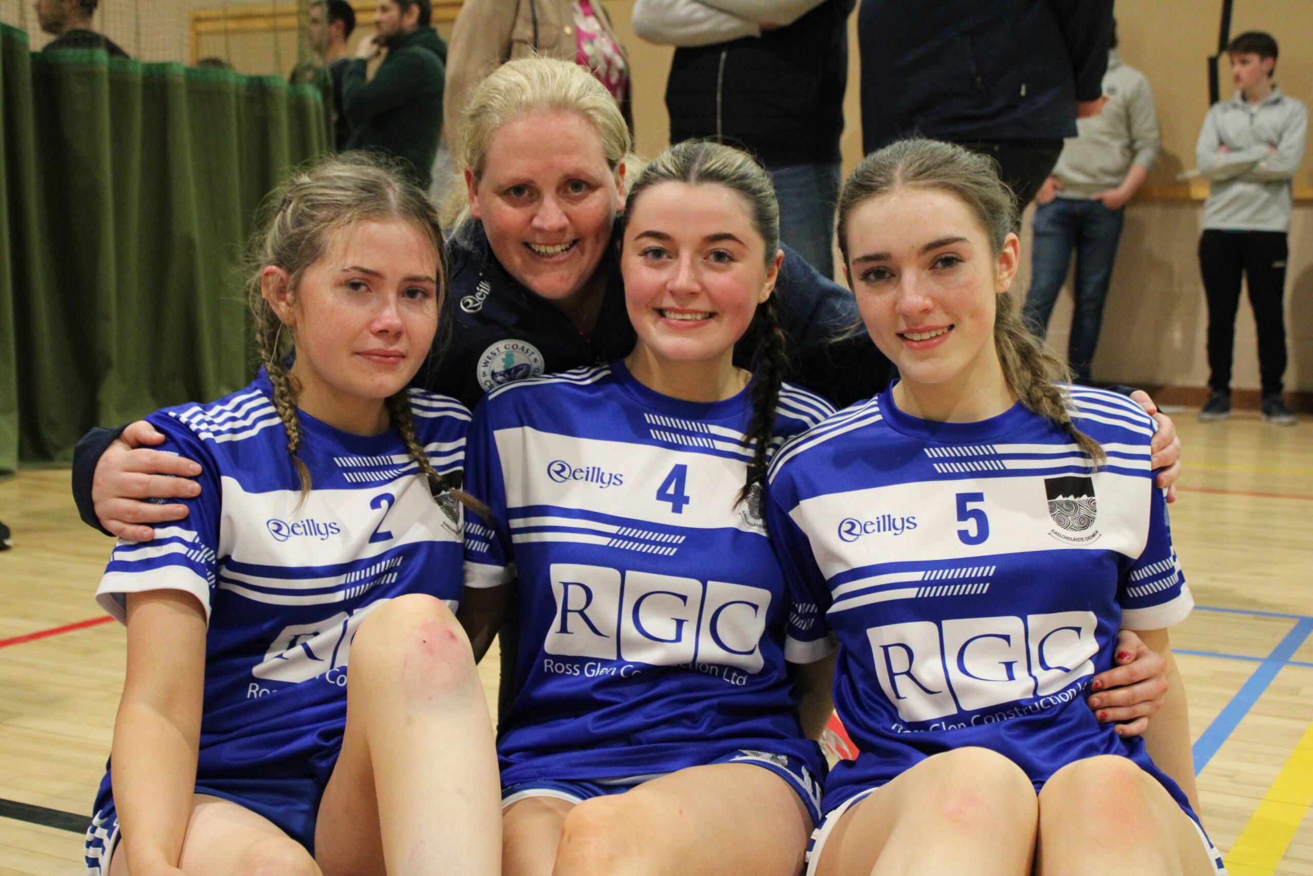 Tá foireann buachaillí agus cailíní ag imirt sacair do Ghaelcholáiste Chomáin.